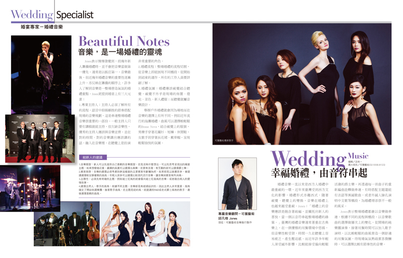Jones表示慢慢發覺到,前幾年新人籌備婚禮時,並不會把音樂當做第一優先,通常是以飯店第一,音樂最後,但近幾年婚禮音樂的重要性逐漸上升,亦反映在籌備的順序上,許多人了解到音樂是一整場營造氣氛的婚禮重點。Jones更提到婚宴上有三大元素: